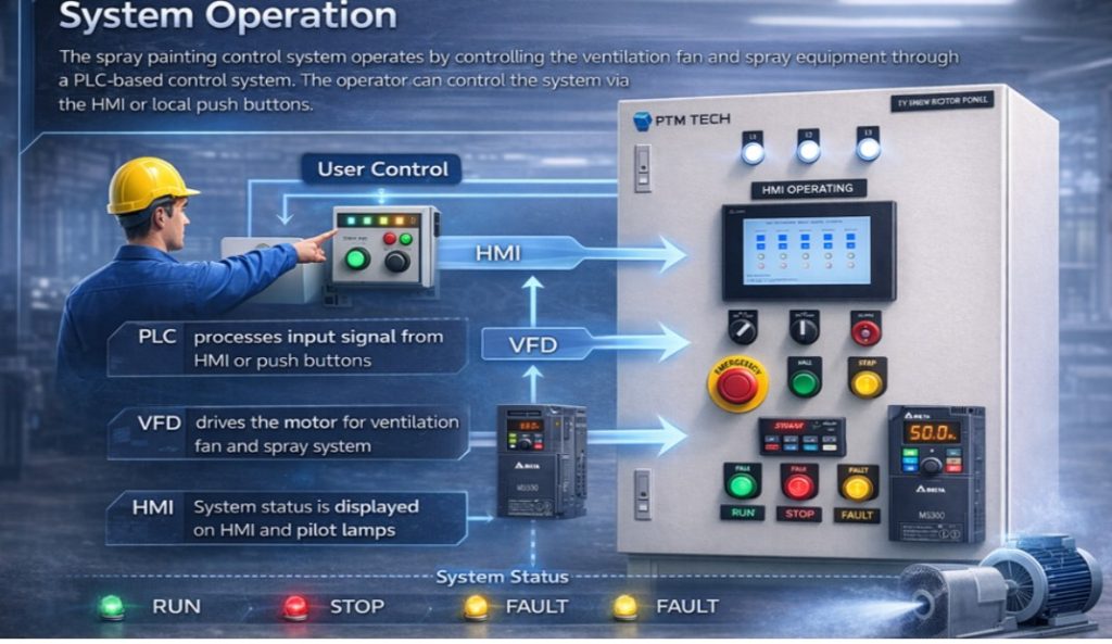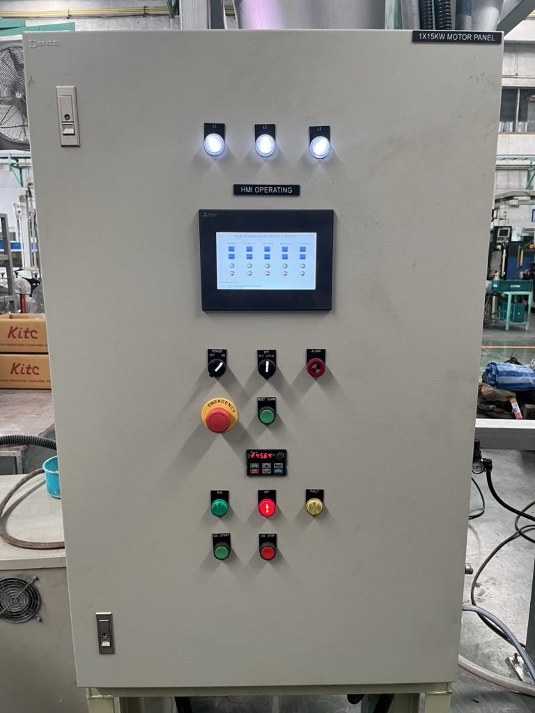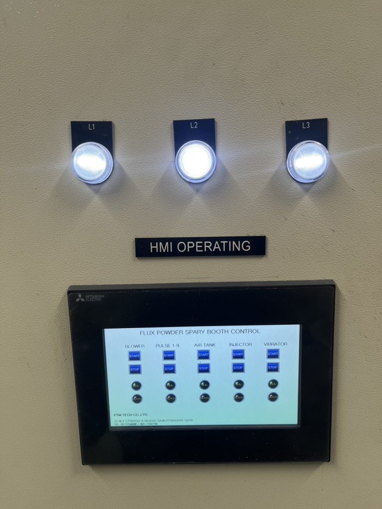 ตู้ควบคุมระบบพ่นสีชุดนี้ถูกออกแบบมาเพื่อควบคุมการทำงานของ Flux Powder Spray Booth Control ให้สามารถสั่งงานได้อย่างสะดวกและมีประสิทธิภาพ โดยใช้ Mitsubishi Electric PLC รุ่น FX3S-30MT/ES เป็นหน่วยประมวลผลหลัก ทำหน้าที่รับคำสั่งจากหน้าจอ HMI และควบคุมอุปกรณ์ต่าง ๆ ภายในระบบ