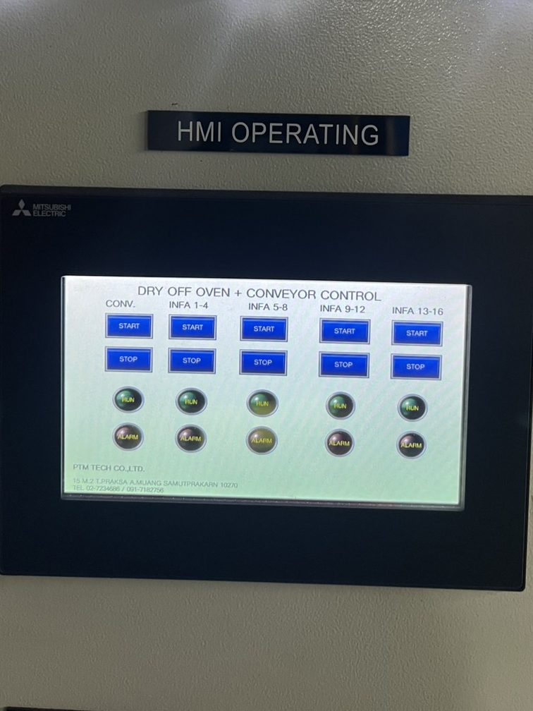 หน้าจอ HMI ถูกออกแบบให้ใช้งานง่าย รองรับการควบคุมระบบพ่นสีฝุ่นโดยเฉพาะ ผู้ใช้งานสามารถสั่ง Start / Stop ระบบ ตรวจสอบสถานะเครื่องจักร ดู Alarm และติดตามการทำงานของพัดลมรวมถึงหัวจ่ายสีได้จากหน้าจอเดียว ช่วยลดภาระผู้ปฏิบัติงานและเพิ่มความแม่นยำในการควบคุม